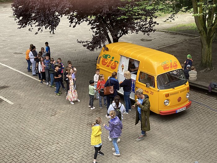 Zum Ende des Schuljahres kam der gelbe Eisbulli auf den Schulhof der Georgschule gefahren. Jedes Kind durfte sich bis zu zwei Kugeln Eis auswählen. Ob Erdbeereis, Schokolade, Vanille oder Stracciatella - alle fanden ihr Lieblingseis und schleckten um die Wette. Dass der Eisbulli zur Georgschule kam, ist dem Förderverein zu verdanken, der diese Aktion als ein besonderes Dankeschön für die großartige Unterstützung unserer Schülerinnen und Schüler bei der Sparda Spendenwahl möglich gemacht hat.