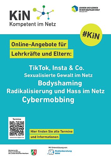 Scannen Sie den QR-Code auf dem Poster und Sie erhalten Informationen zu einem vom Ministerium für Schule und Bildung des Landes NRW und der Medienberatung NRW unterstützten Projekt (KiN = Kompetent im Netz) mit dem Ziel, Eltern und Lehrkräfte in Bezug auf die Medienerziehung zu sensibilisieren.