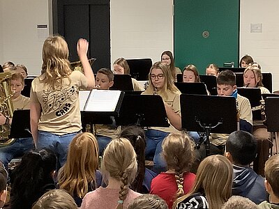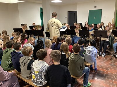 Wie jedes Jahr im November war auch in diesem Schuljahr die Bläserklasse der Christian Rohlfs Realschule zu Besuch an der Georg-Grundschule. Die Klasse 6b spielte mit ihrer Band vor unseren Viertklässlerinnen und -klässlern auf. Neben beeindruckenden Musikstücken gab es auch viele Informationen rund um Blasinstrumente und Komponisten der vorgetragenen Stücke zu hören. Besonders freute uns, dass auch ehemalige GeorgschülerInnen unter den Musikern waren und an ihrer alten Grundschule zeigen konnten, welche großartigen Fortschritte sie beim Erlernen ihres Musikinstrumentes gemacht haben. Wir danken Herrn Ruholt und der gesamten Klasse 6b der CRRS für ihren Auftritt bei uns in der Georggrundschule!