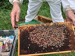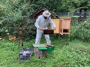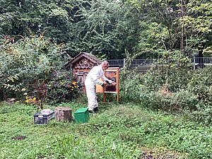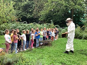 Über die Stiftung Hellweg-Region sollen alle Soester Grundschule einen Bienenschaukasten erhalten. Diese Schaukästen sollen den Betrieb innerhalb eines Bienenstockes veranschaulichen. Sie können zu Schulungszwecken oder zur Beobachtung von Bienen genutzt werden, indem ein Holzdeckel geöffnet wird und die Bienen des Stockes hinter einer Plexiglasscheibe betrachtet werden können. An der Georg-Grundschule wurde dieser Schaukasten bereits vor den Sommerferien im Schulgarten installiert. Nun zogen endlich auch die ersten Bienen ein. Herr Busch, 1. Vorsitzender des Soester Imkervereins, setzte drei Waben in den Schaukasten ein und wurde dabei vorsichtig und mit Abstand von den Kindern der Klasse 2b beobachtet. Dabei wurde u.a. auch die Königin bestaunt und viele Kinderfragen beantwortet. Lange werden die Bienen allerdings nicht in ihren neuen Zuhause an der Georg-Grundschule bleiben - schon in wenigen Wochen werden sie ihr Winterquartier beziehen, denn im Spätsommer finden sie nicht mehr genügend Nahrung. Doch im nächsten Frühjahr werden sie wieder zurückkehren, vllt. sogar mit einem Glas Honig für die Georg-Grundschule.